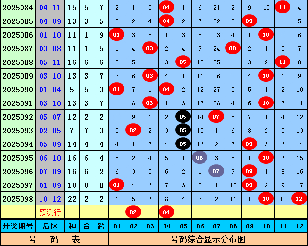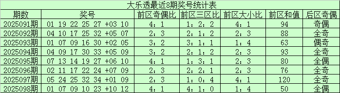 大乐透第2025098期奖号为:前区:01、07、09、10、23,后区:10、12。其中前区奇偶比为4:1,大小比为1:4,三区比为4:1:0,和值为50。