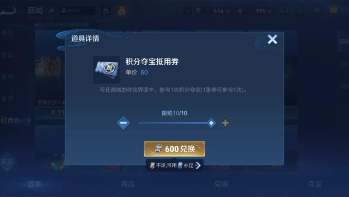 积分夺宝券这个道具一个都价值60点券呢,大家发现了吗?不管什么活动能兑换到的积分夺宝券,都是有次数限制的,这次限时点券活动一共能兑换10张积分夺宝券,像战令系统商店这里,一个赛季的战令币只能兑换2张积分夺宝券,再多就兑换不了了,最近不少玩家都表示抽水晶的几率非常高,用限时点券兑换的积分夺宝券很容易抽到荣耀水晶,如果你想要荣耀典藏皮肤的话,不妨可以兑换几张积分夺宝券碰碰运气。