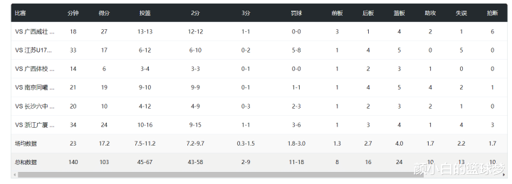 这七场比赛赵昱锟场均23分钟,拿到17.2分4篮板1.7助攻1.7抢断1.2盖帽,命中率67.1%,三分命中率20%,罚球命中率60%,他场均只出手1.5个三分球,很明显他最大的软肋是投射能力,作为一个2.03米的锋线篮下的终结效率已经很高,但投射太差,如果投射不解决未来的上限肯定不会太高,朱芳雨应该多提醒一下。