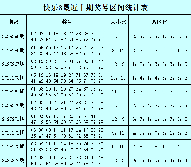 福彩快乐8第2025274期奖号为:02 03 10 18 26 31 33 34 46 49 50 51 54 55 60 62 74 75 76 80,其中奖号大小比为12:8,八区比为3:1:1:3:3:4:1:4。