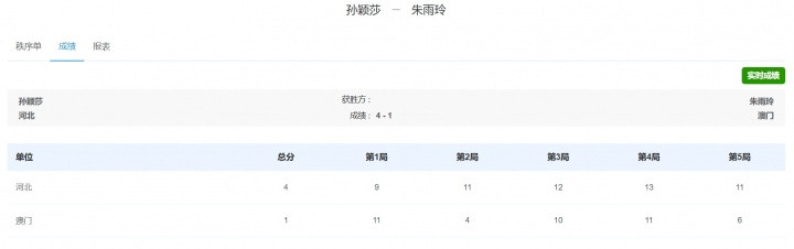 直播吧11月15日讯 全运会乒乓球女单半决赛,河北队的孙颖莎vs中国澳门队的朱雨玲。经过5局较量,孙颖莎4-1战胜朱雨玲,晋级决赛。