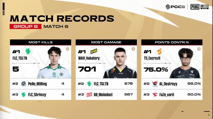 阶段7,BB与WOLF交战,CTG前来劝架,打倒WOLF两人后,CTG被WOLF最后一人淘汰。随后VP贴到近点,将WOLF最后两人淘汰。决赛圈,FLC保持满编,VP和BB都仅剩一人,FLC轻松吃鸡。