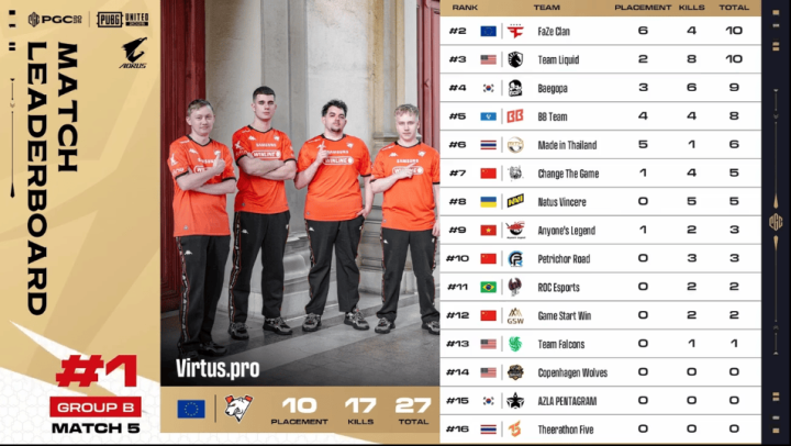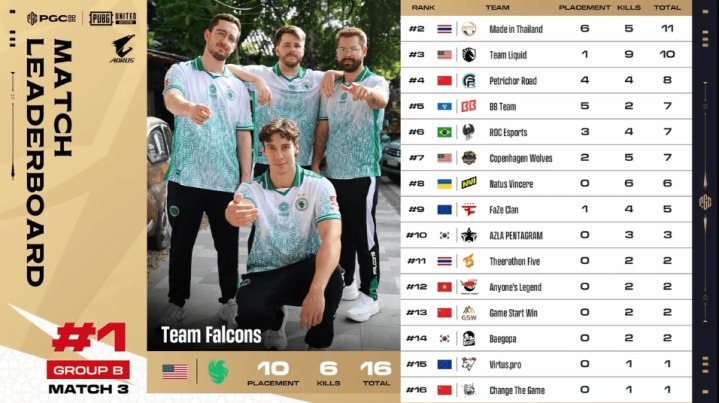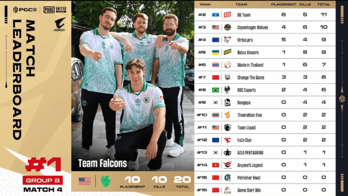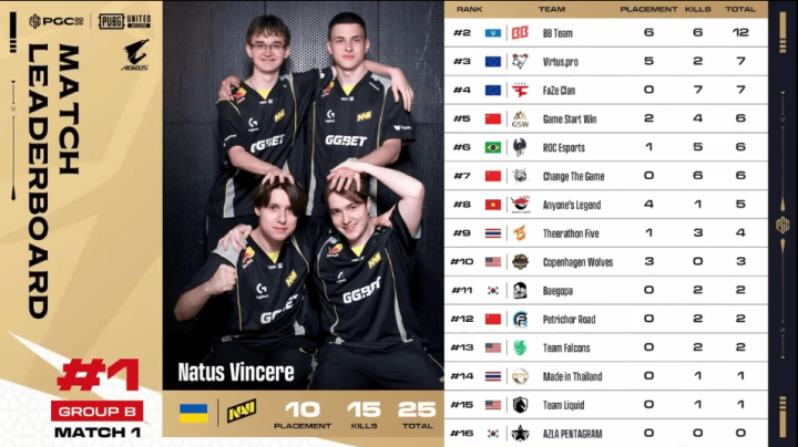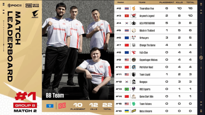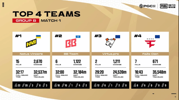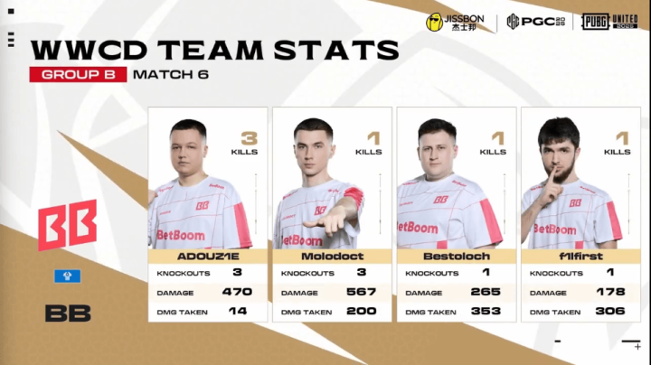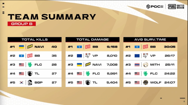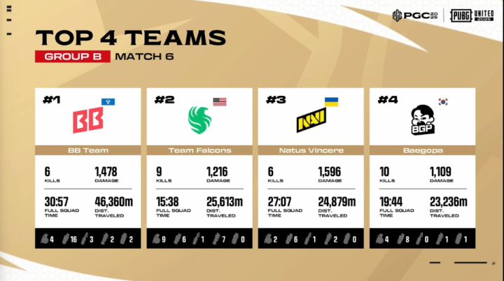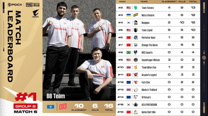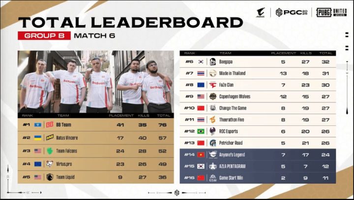 决赛圈,FLC两人先被淘汰出局。阶段8,TL先被两队夹击,TL三人被淘汰,随后NAVI两人也被BB打掉,最终BB抓住优势将NAVI最后一人淘汰,