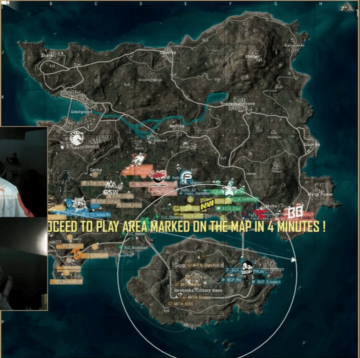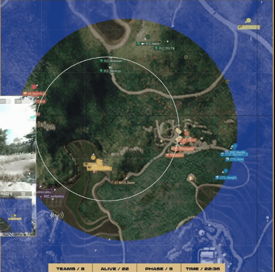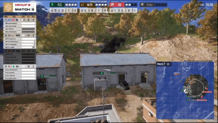 决赛圈,MITH开车贴到BB近点,将BB两人打掉,最终圈中剩余FLC与MITH两支队伍,FLC打掉近点MITH埋点位,FLC掌握人数绝对优势,最终FLC淘汰MITH最后两人成功吃鸡。