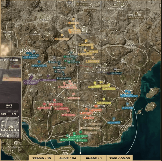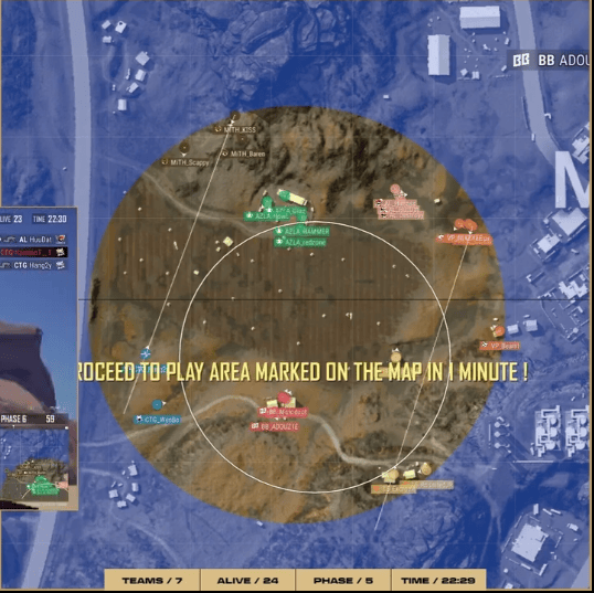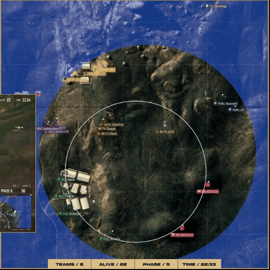 阶段6,圈型刷到摩托城西部麦田。MITH撞击AZLA房区,AZLA防守成功收掉MITH两分,AL独狼也被淘汰出局。
