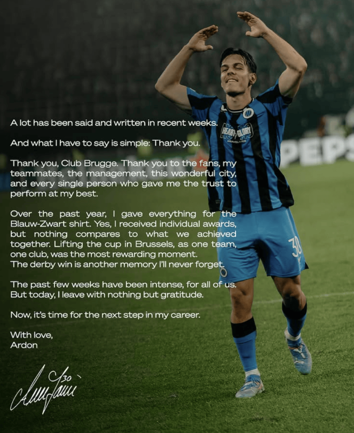 谢谢你,布鲁日俱乐部。谢谢球迷们,我的队友们,管理层,这座美丽的城市,以及每一位给予我信任、让我发挥出最佳水平的人。