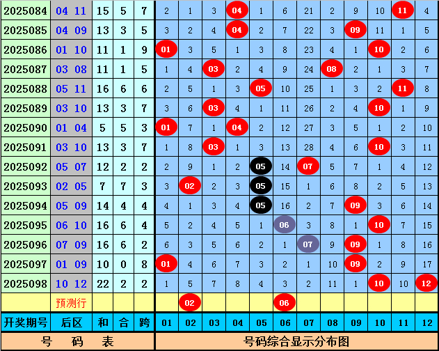 后区号码分析:在第099期历史同期开奖中奖,奖号05出现6次,奖号07出现5次,奖号01出现4次,奖号04 06 08 10 12出现3次,奖号03出现2次,奖号02 09出现1次,奖号11没有出现。本期后区五码参考02、04、06、08、12。