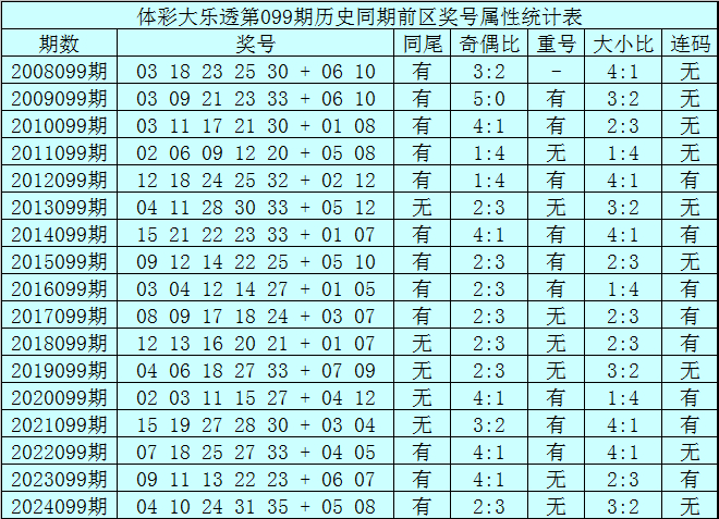 体彩大乐透第099期历史同期开出17次奖号,其统计详见下表: