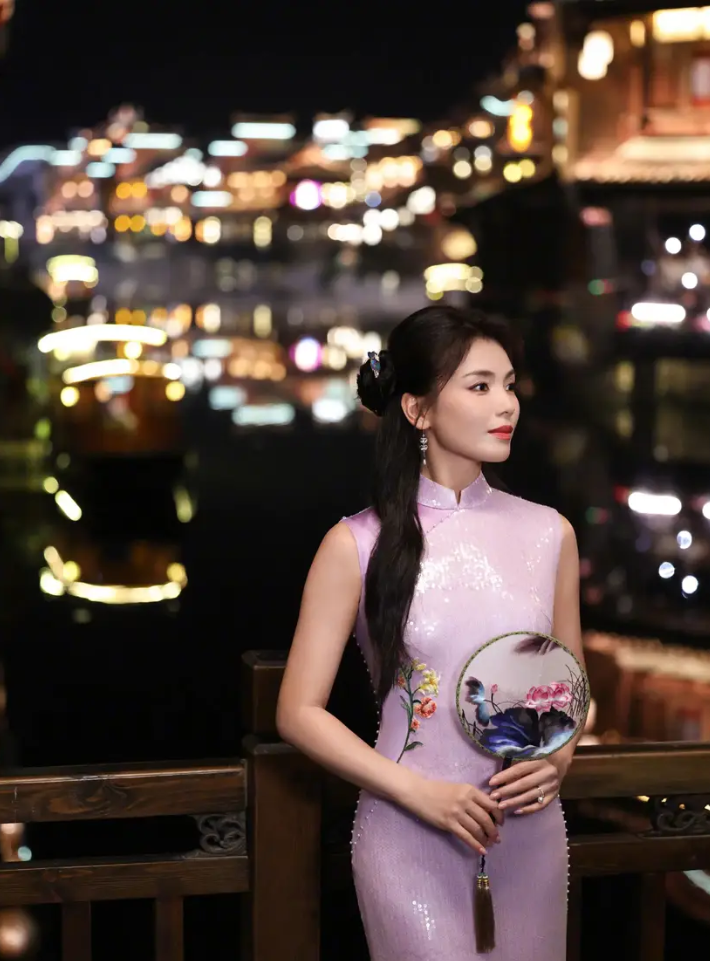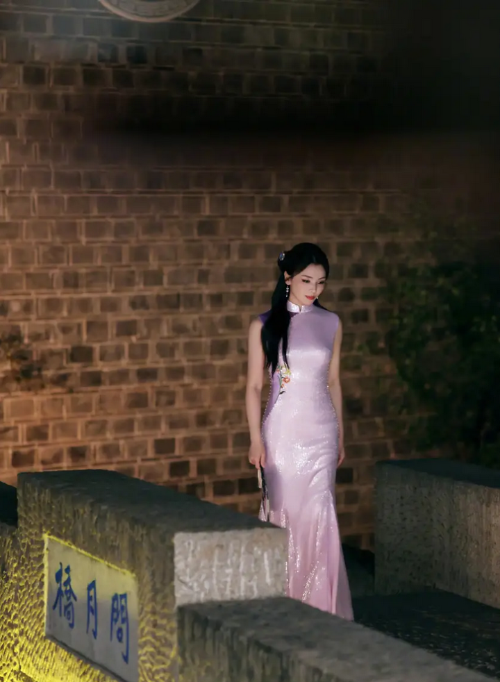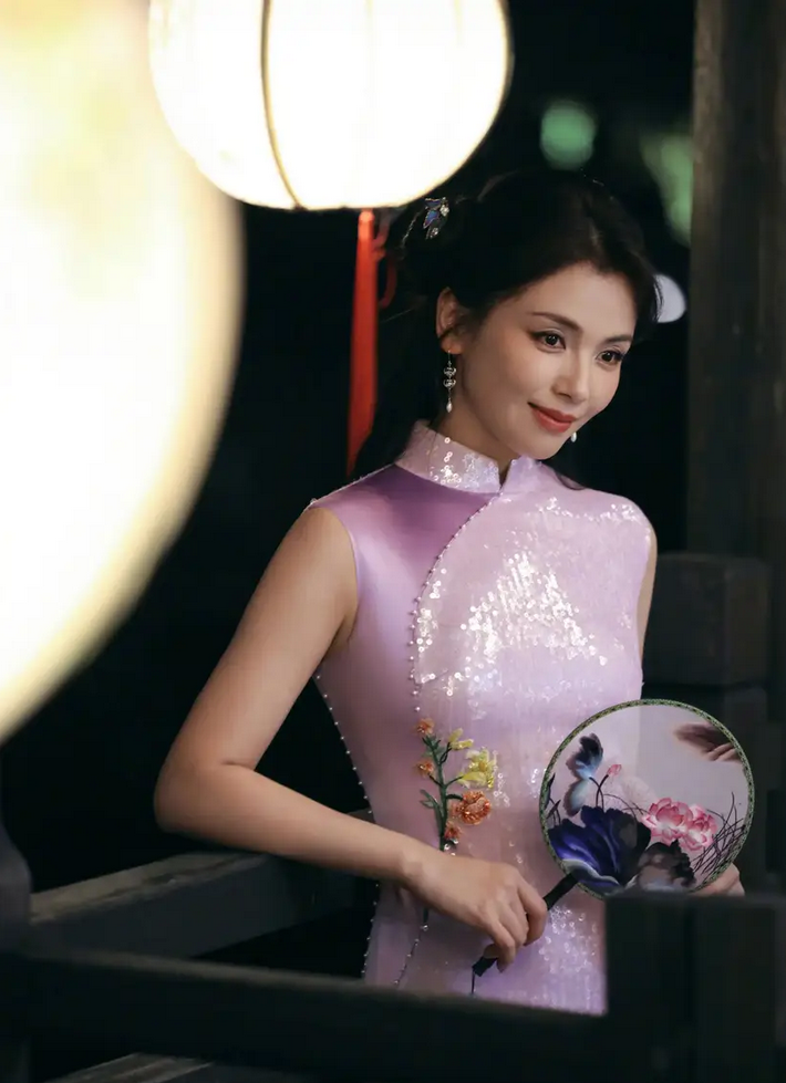 穿淡紫色无袖旗袍,勾勒出身材曲线,韵味十足