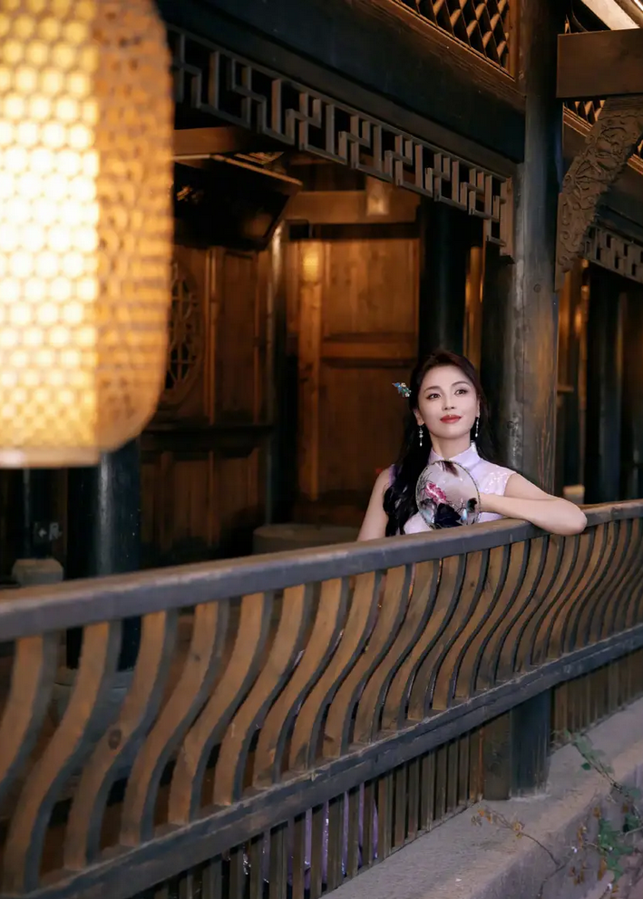 栏杆远望,身姿绰约,好一个温婉的江南美人