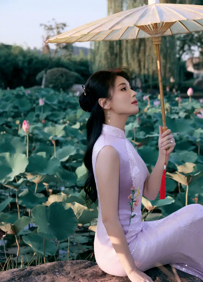 刘涛晒出江南美人造型美照, 温柔妩媚! 穿淡紫色无袖旗袍韵味十足