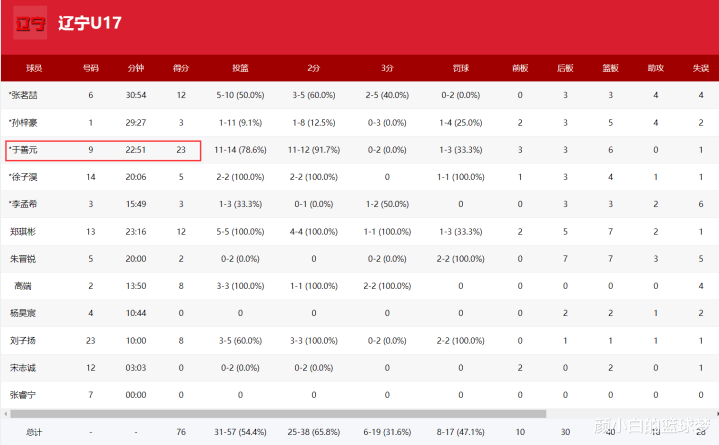 这场比赛于善元打了22分钟,14中11,罚球3中1,三分2中0,拿到23分6篮板1盖帽1失误,命中率78.6%,全队只有三人上双,张茗喆10中5拿到12分4助攻4失误,郑琪彬5中5拿到12分7篮板。