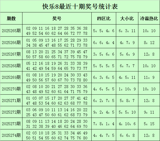 福彩快乐8第2025274期开奖回顾:02 03 10 18 26 31 33 34 46 49 50 51 54 55 60 62 74 75 76 80,其中奖号四区比为4:4:7:5,冷温热码比为6:6:8,大小比为12:8,和值为889,同尾号码为10 50 60 80、31 51、02 62、03 33、34 54 74、55 75、26 46 76。