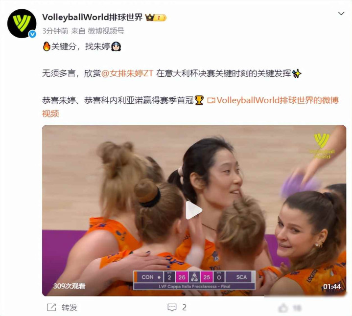 意大利女排杯决赛刚刚结束,科内利亚诺以3比0战胜斯坎迪奇,三局比分咬得很紧,分别是31比29、26比24和27比25,每一局都只差两分就决定胜负,朱婷在比赛中扣球得到12分,完成一次拦网,接一传28次没有失误,当决胜局打到25平时,她连续拿下两分,直接帮助球队锁定胜利,国际排联特意发推文说“关键分找朱婷”,这已经是朱婷获得的第24个冠军。