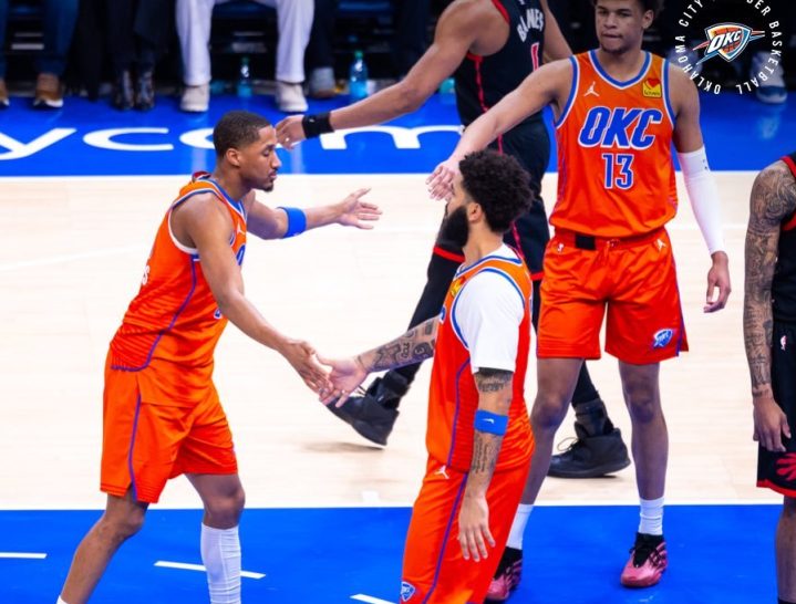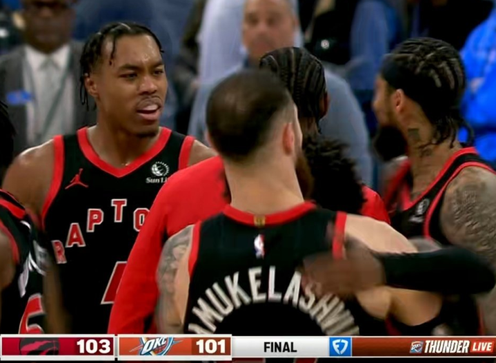 雷霆和猛龙一战,双方各打了两节好球,但分差始终没有超过7分。比赛最后4分钟达到高潮,巴恩斯空切暴扣带队追到只差1分,亚历山大被包夹,给队友的传球,大空位三分不中。巴恩斯造犯规,雷霆直接挑战成功,罚球被取消。亚历山大攻框就能拿到罚球机会。不过最后2分钟,奎克利轰进关键三分球,亚历山大继续被包夹,队友依旧三分不中,奎克利再中三分。霍姆格伦补篮维持一丝悬念,霍姆格伦的跳投,被巴恩斯迎面大帽扇出,随后巴恩斯抢先一步拿到球权。雷霆先用犯规战术,猛龙谢德两罚不中!