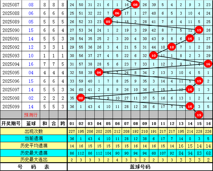 蓝球号码分析:上期蓝球为14,开出2路号码,蓝球最近10期012路比为3:3:4,最近30期012路比为10:6:14,最近100期012路比为31:30:39,本期蓝球看好0路号码,四码蓝球参考06、09、12、15。