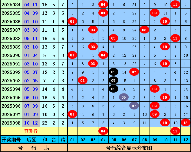 后区分析(一区01-04,二区05-08,三区09-12):上期后区开出奖号10和12,最近10期后区三区落号比为6:11:8,本期后区关注号码01、04、07、08、11,后区两码参考04、11。