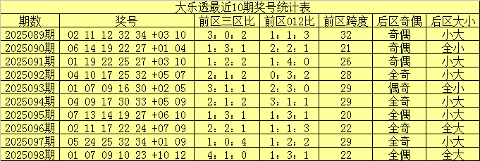 大乐透第2025098期奖号开出:01 07 09 10 23 +10 12。其中前区三区比为4:1:0,012路比为1:3:1,后区开出全大、全偶奖号。