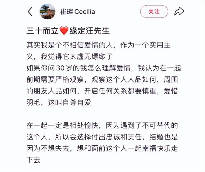 在社交软件中,崔璨发文表示对汪雨的爱。