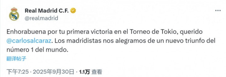 皇马官方社媒写道:“亲爱的阿尔卡拉斯,祝贺你首次赢得ATP东京站冠军,皇马球迷为世界第一的又一次夺冠感到高兴。”
