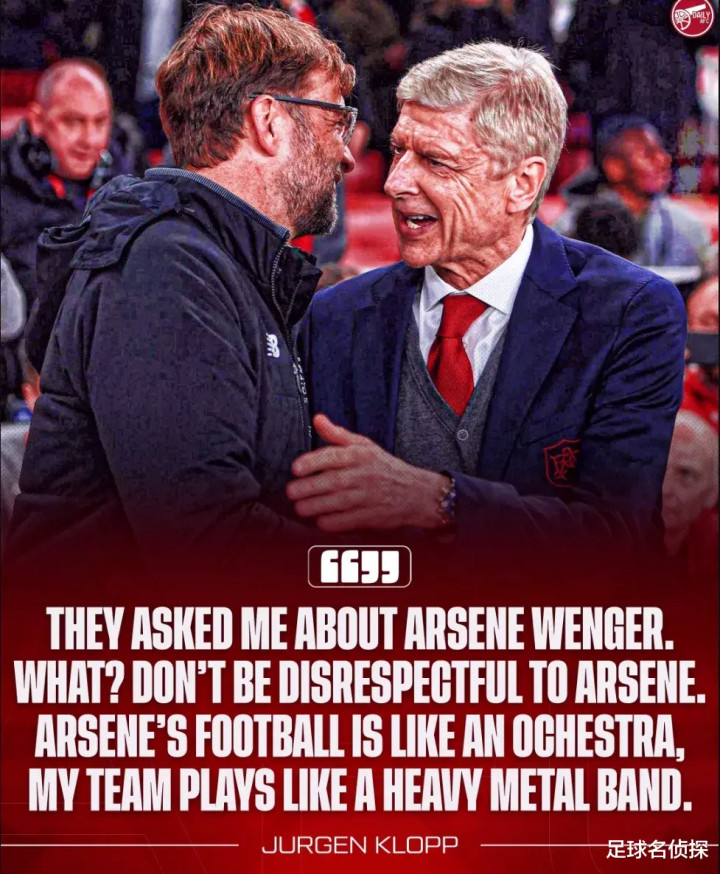 克洛普说:“他们问我和温格比较怎么样,啥?别对温格无礼……教授的足球就像管弦乐,我的球队比赛风格更像是重金属乐队。”