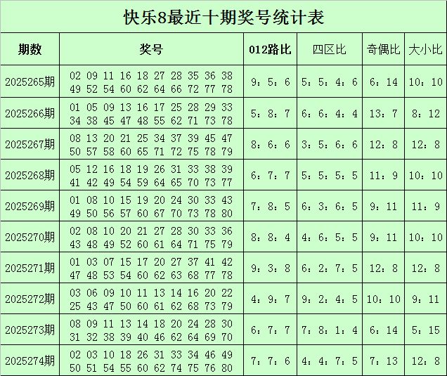 福彩快乐8第2025274期开奖回顾:02 03 10 18 26 31 33 34 46 49 50 51 54 55 60 62 74 75 76 80,其中奖号012路比为7:7:6,四区比为4:4:7:5,奇偶比为7:13,大小比为12:8。